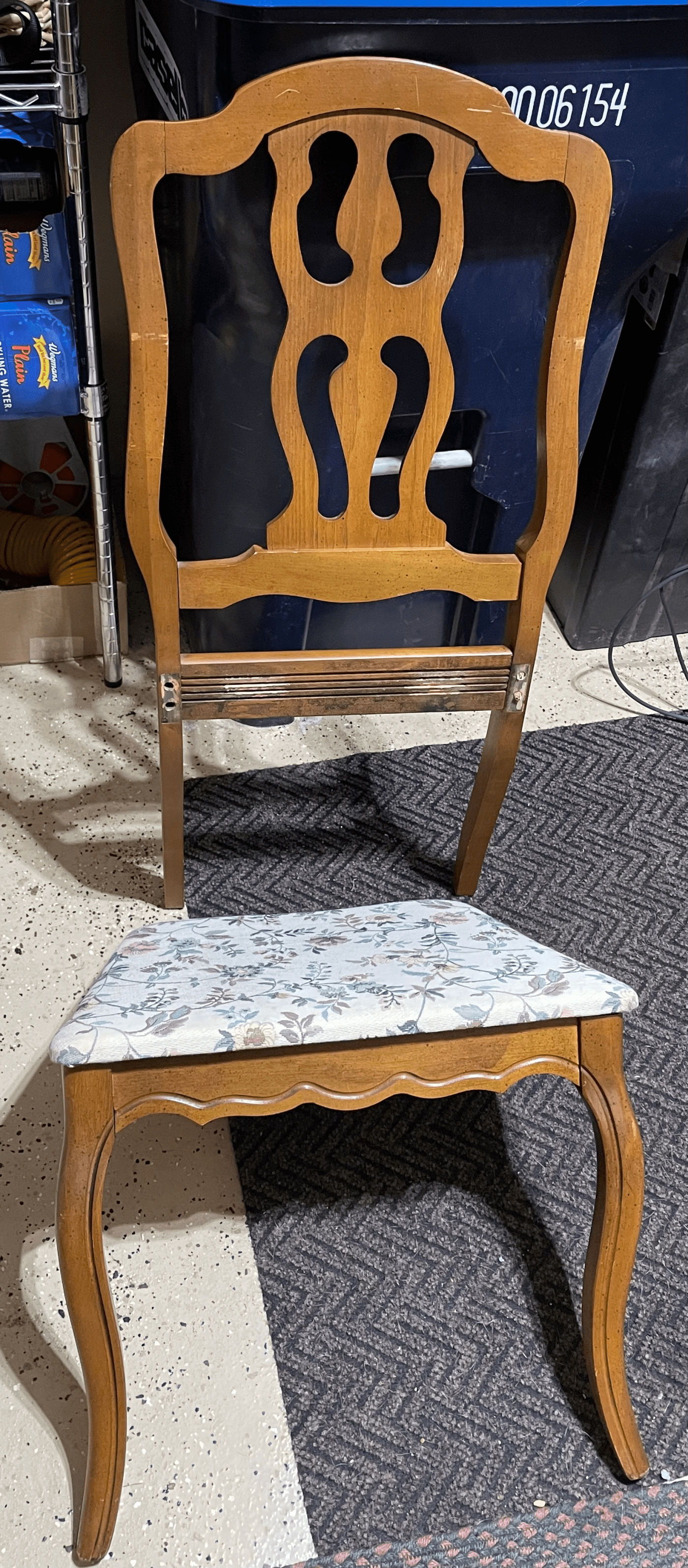 We do that sometimes, though not as often as I’d like. Our schedules are pretty opposite these days. Anyhow, when we got home and walked into the garage, this broken chair greeted us.
