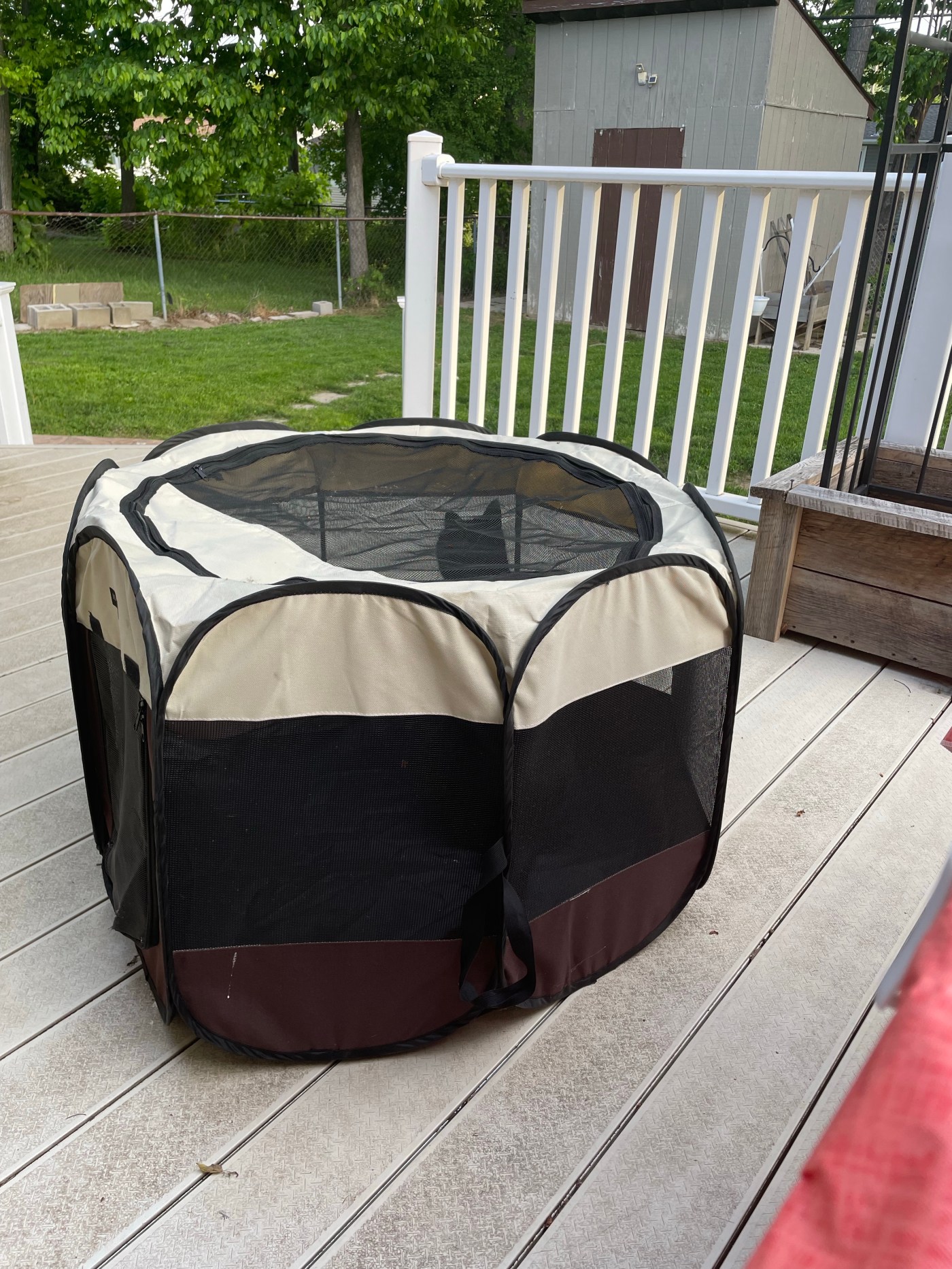 We bought this for him, and he excitedly climbed inside. Though he scratched playfully at us when we zipped the door closed, he was happy to sit outside on the deck and feel the breeze against his face.