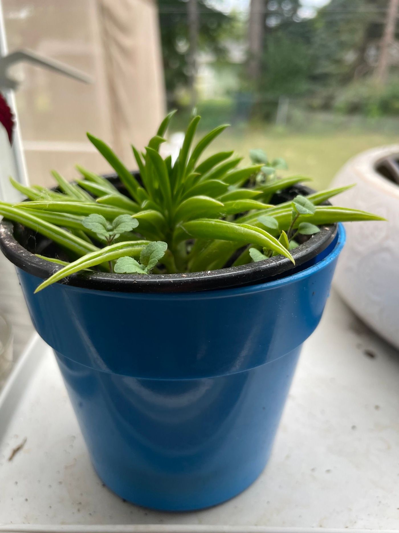 I noticed the other day when I was washing dishes, that another little plant was also growing in that same pot. Something I certainly did not plant, but there it was looking cute and healthy all the same. It looks a bit like one of the other plants I have in the window.