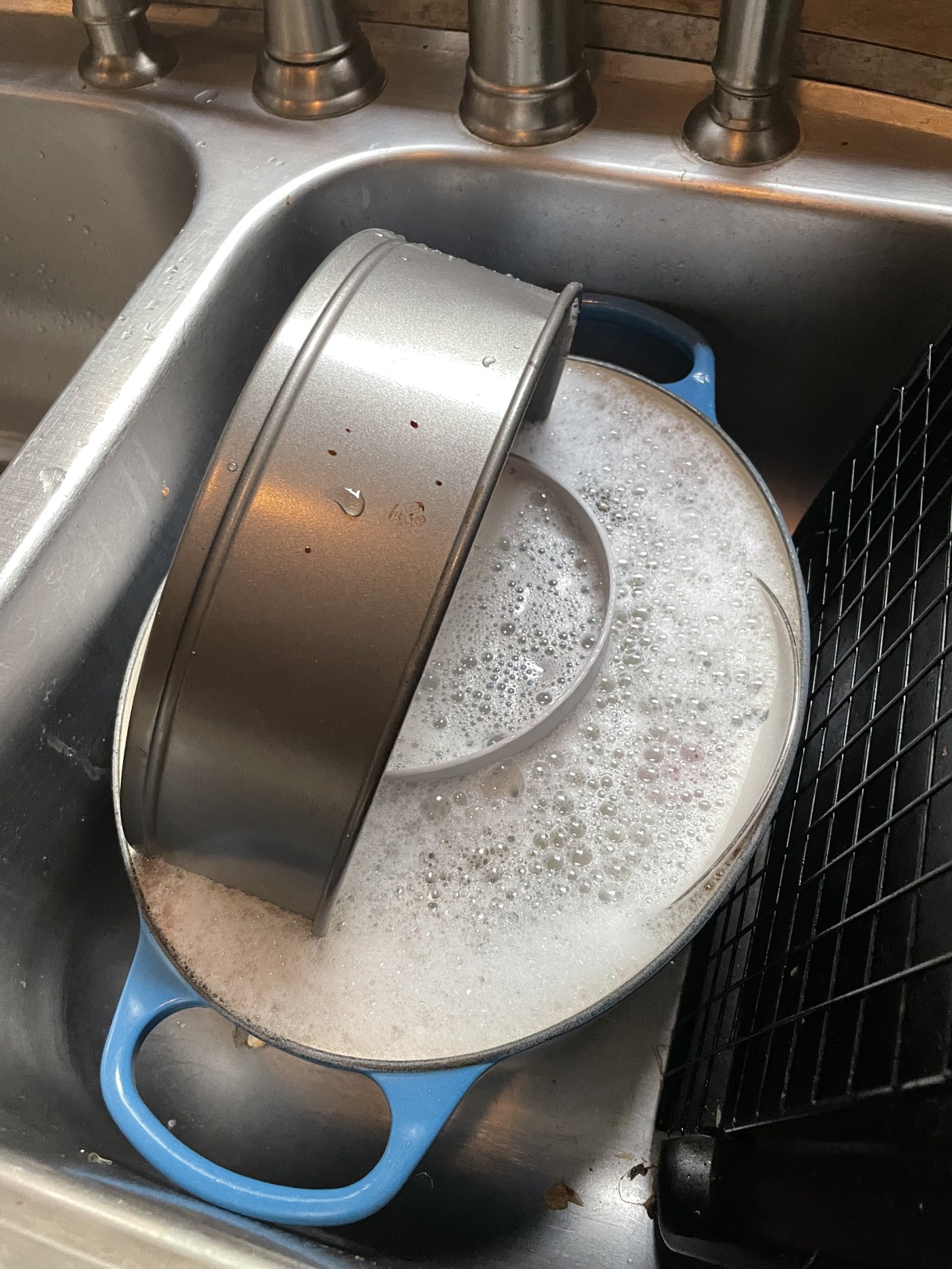 I noticed something interesting, however. Aiming the sprayer directly into those dirty dishes refreshed the soap. It bubbled right back up again, just like it did last night.