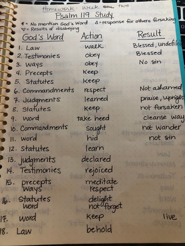 Looking for a simple, yet impactful study of God's Word? Take Psalm 119 verse by verse, and make note of the names for God's Word, the action the writer has taken, and the result of that action. You will see positive and negative results! It will encourage your heart! And keep your mind occupied for... Continue Reading →